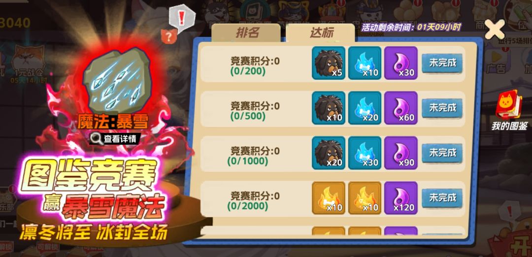 开服2-3天【图鉴竞赛】,比拼角色的收集,多抽宝箱多抽祭坛获得英雄,即可获得更高积分,竞赛中可获得神话魔法石暴雪,就是开场boss使用的那个全屏大招,很华丽。值得注意的是魔法竞赛时,可能会缺图鉴石,可提前囤,最后一天再用一下子拿很多积分,给排名靠前的人一个措手不及。偷榜老六就是我~