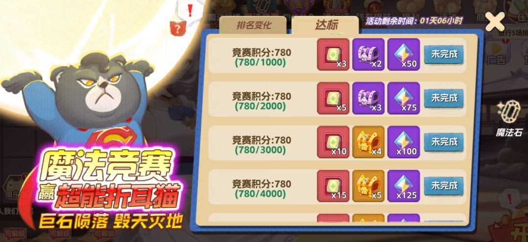 开服4-5天【魔法竞赛】,同期还会开【魔法秘境活动】,可通过魔法秘境来更快获取竞赛积分,有活动就按活动走,往往能以小博大。魔法竞赛中可获得神话英雄超能折耳猫,可以不断积攒能量发出超过屏幕大小的地爆天星,超帅的,好多人发的大球就是他。此外还能在这个活动中获得神话魔法石神愈,性价比很高的活动。