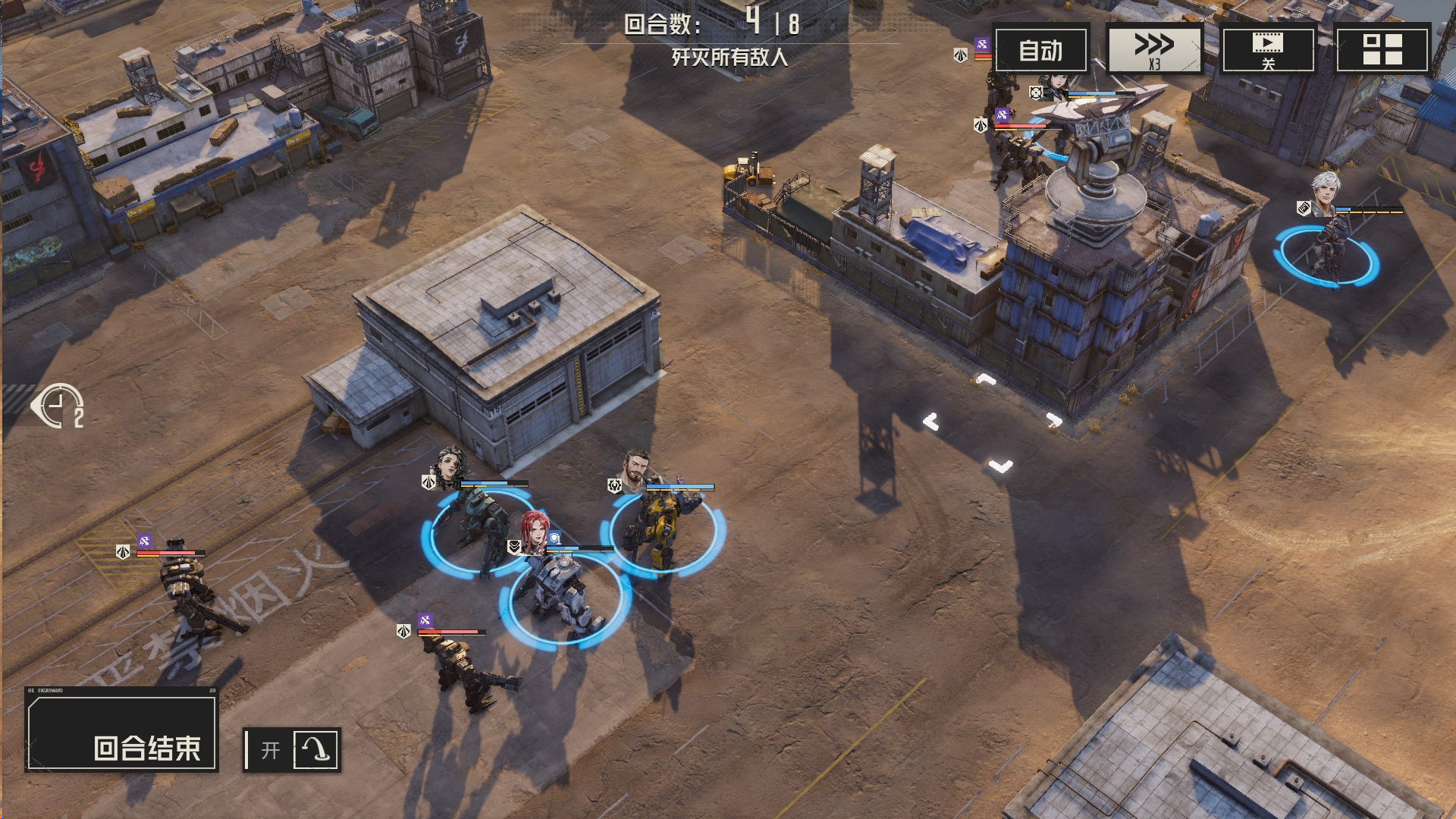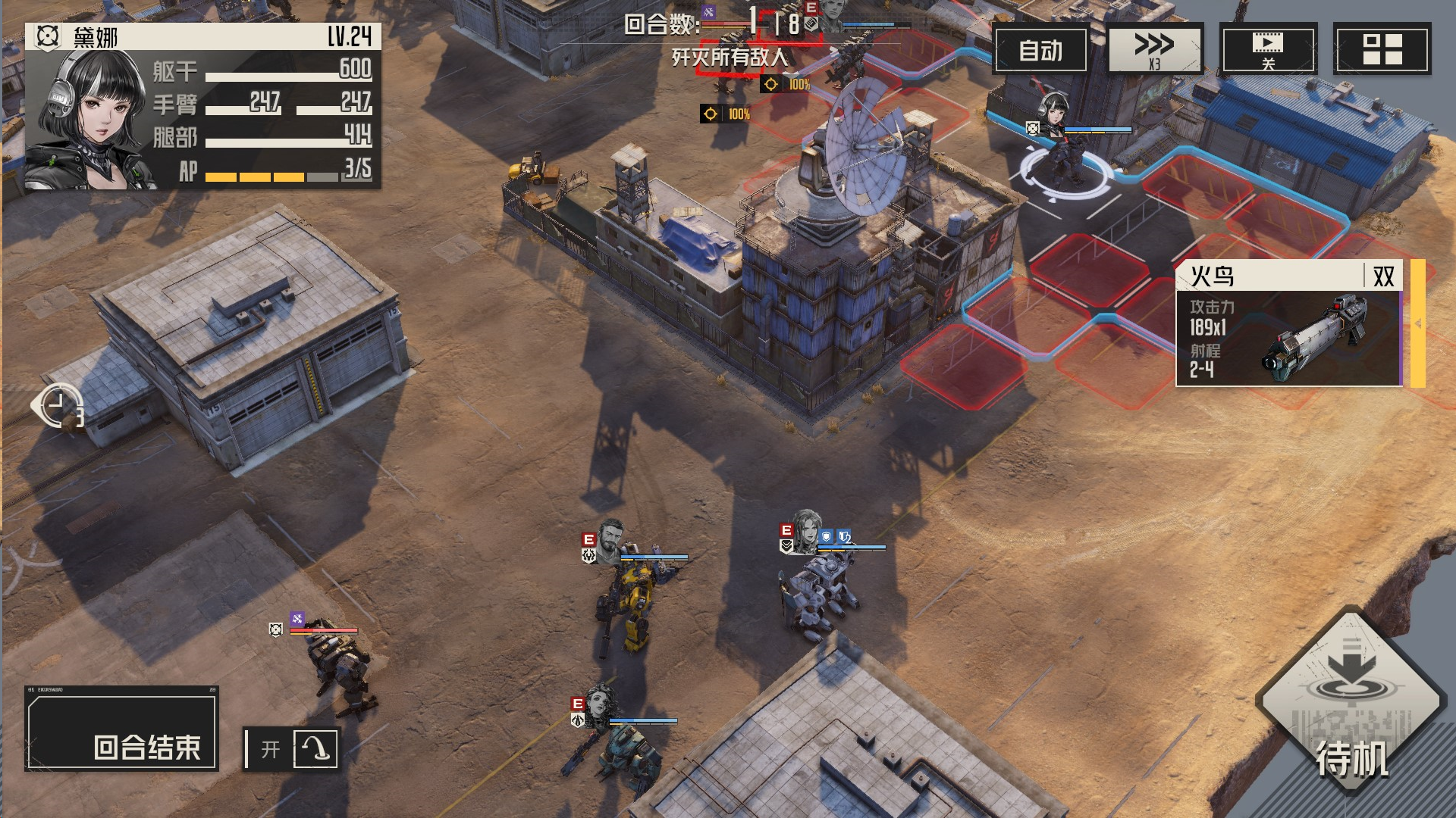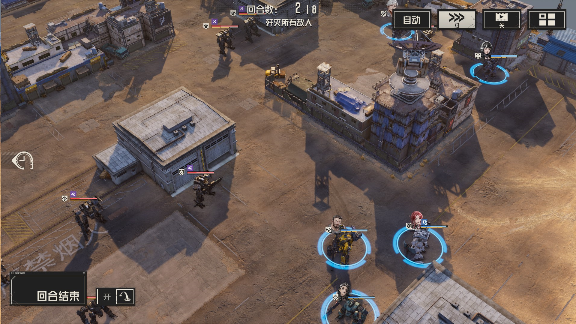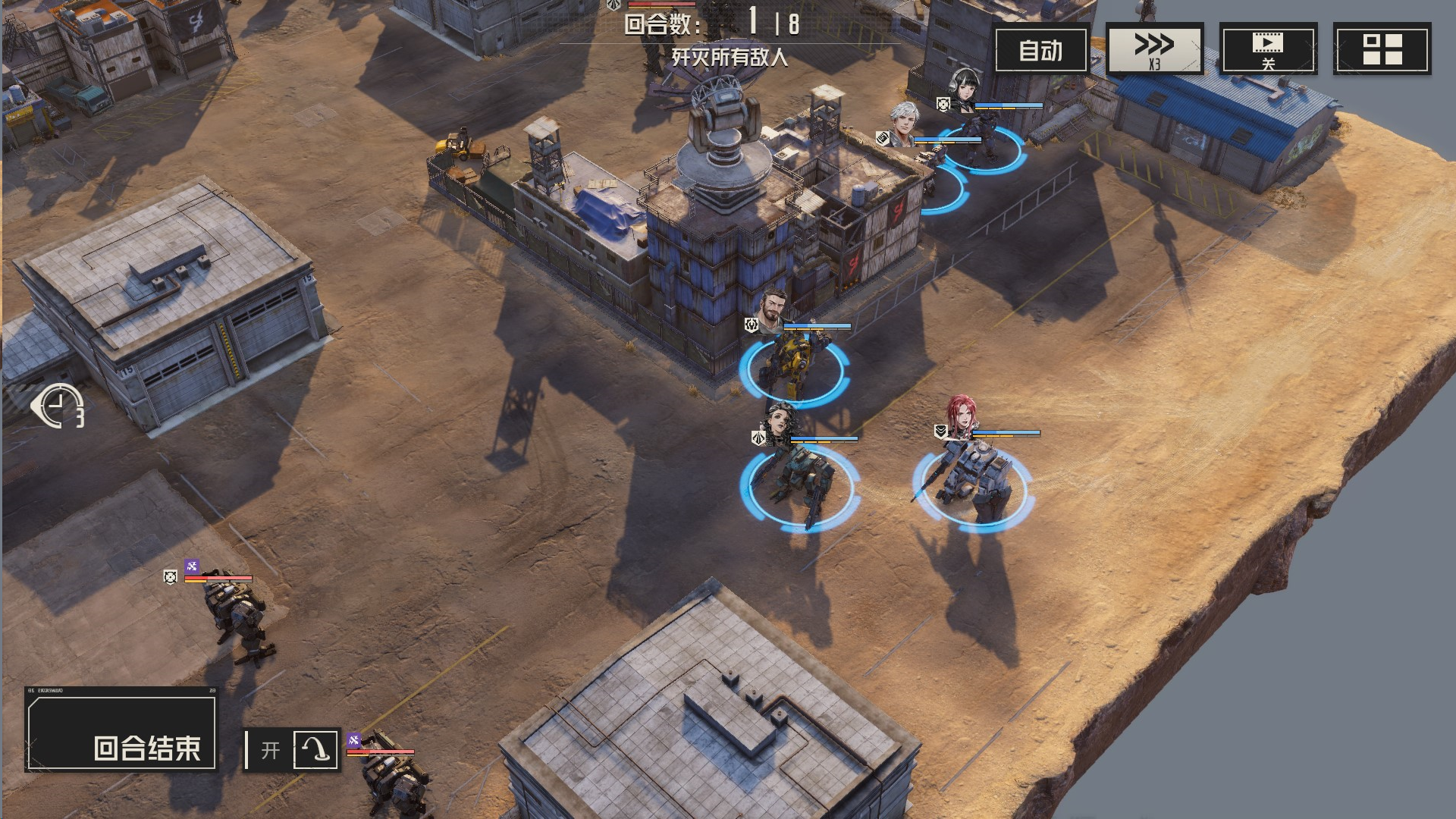 本关解法:每回合,我们集火单一一个敌人,确保能够将敌人消灭或破坏其部位,这样他们便无法恢复血量,我方就可以慢慢将他们消灭