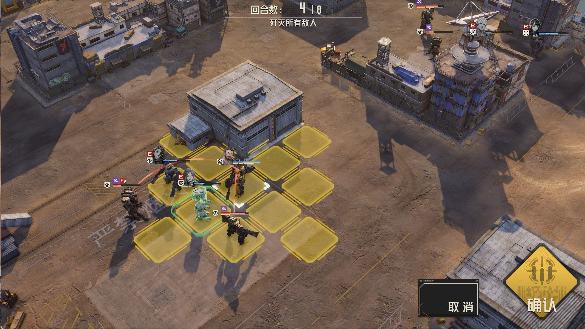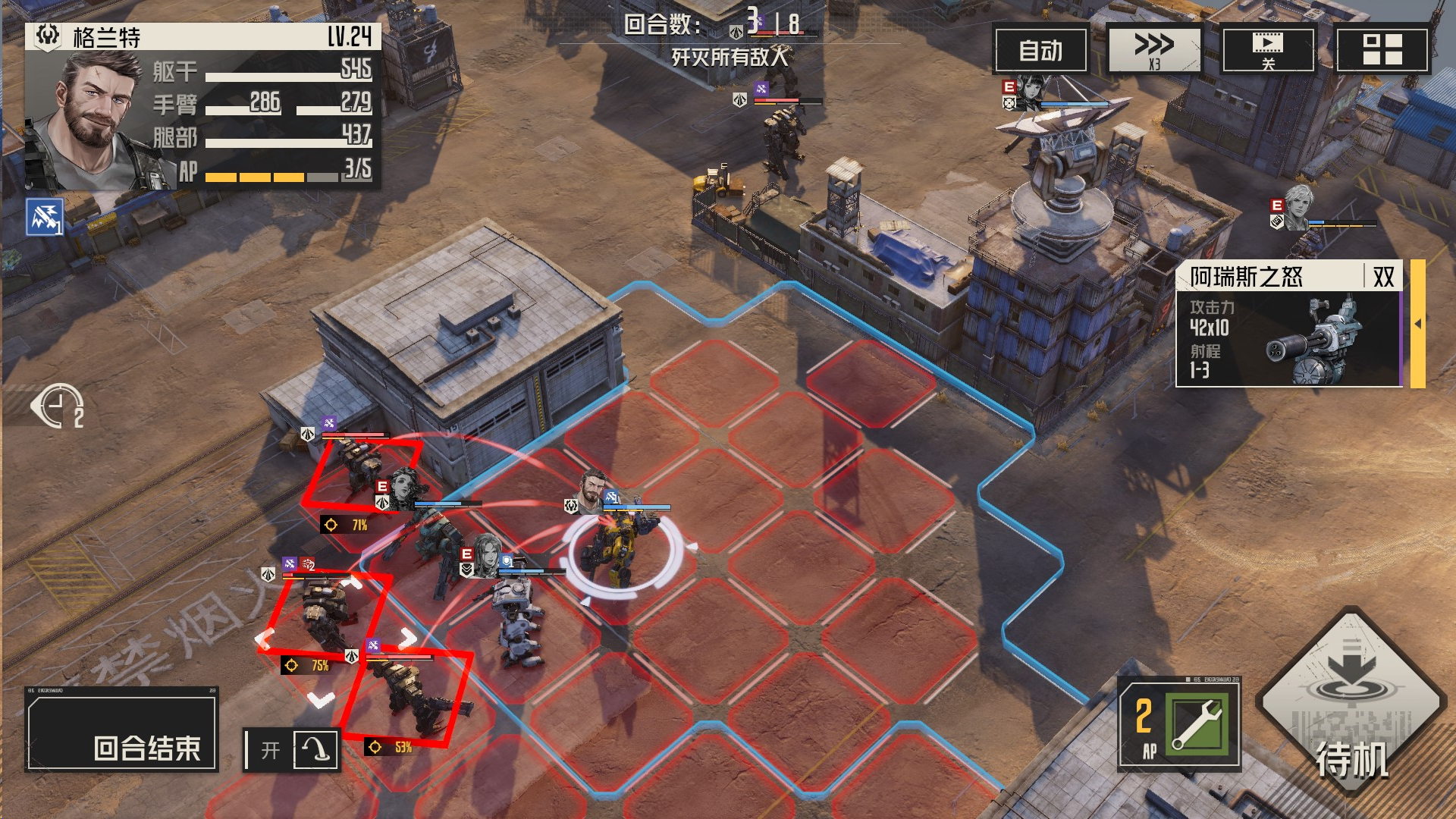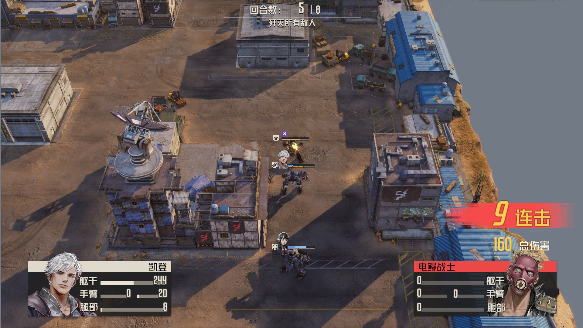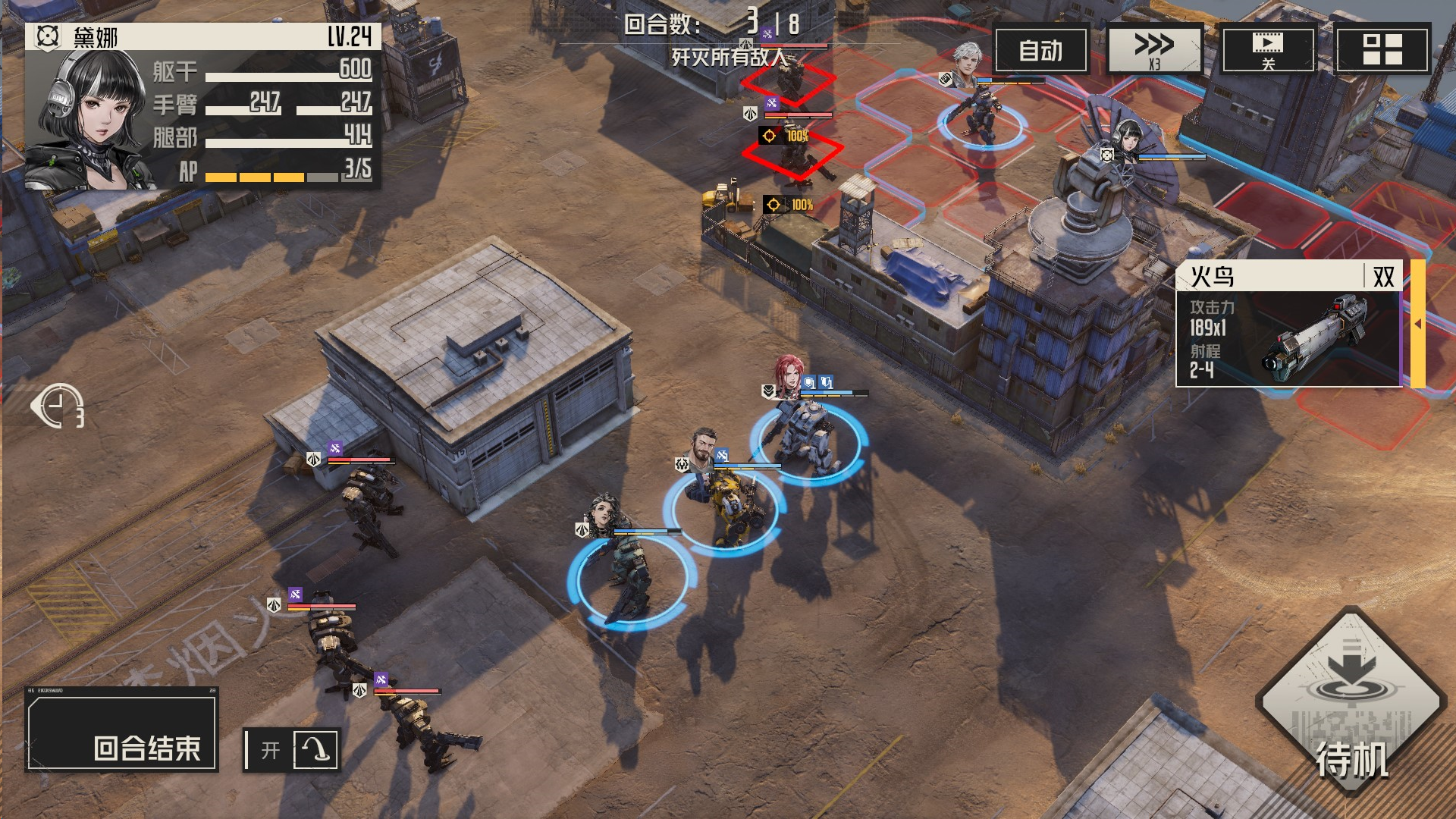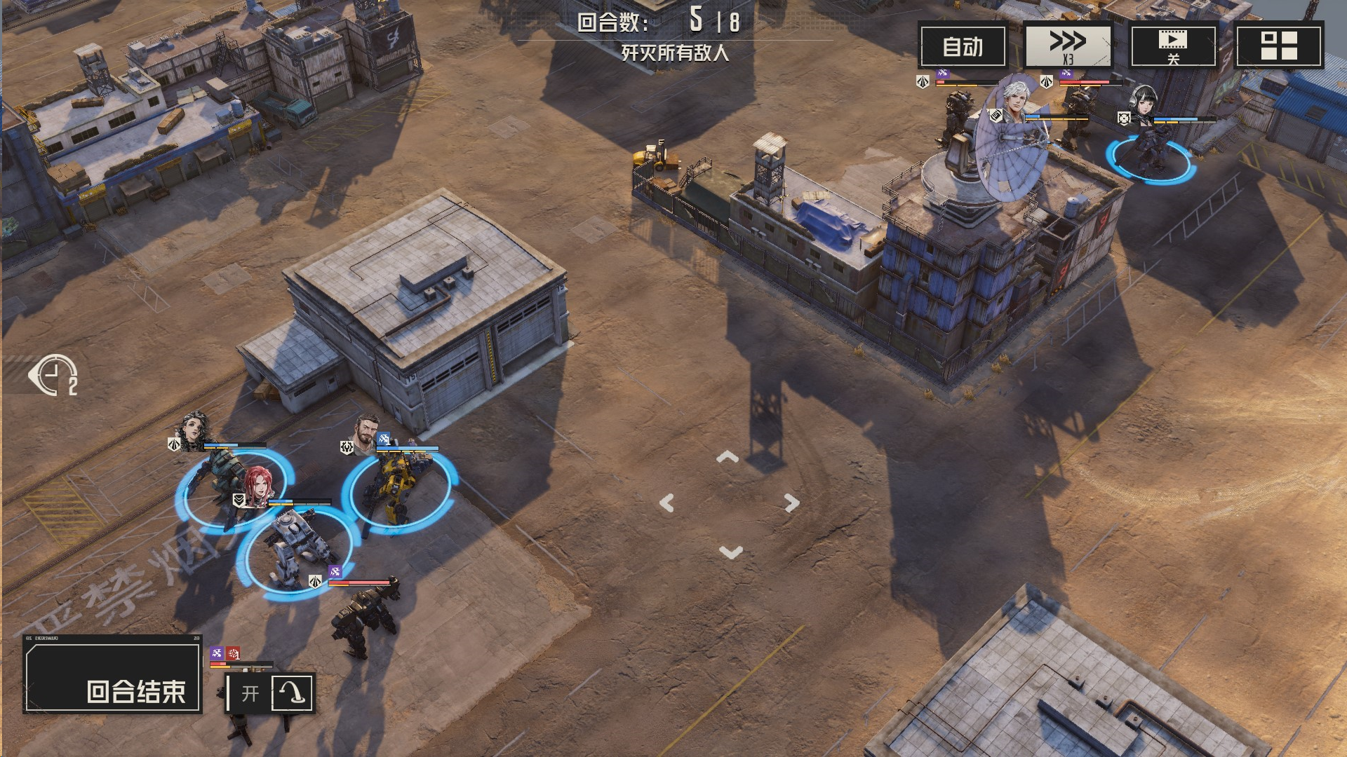 本关解法:每回合,我们集火单一一个敌人,确保能够将敌人消灭或破坏其部位,这样他们便无法恢复血量,我方就可以慢慢将他们消灭
