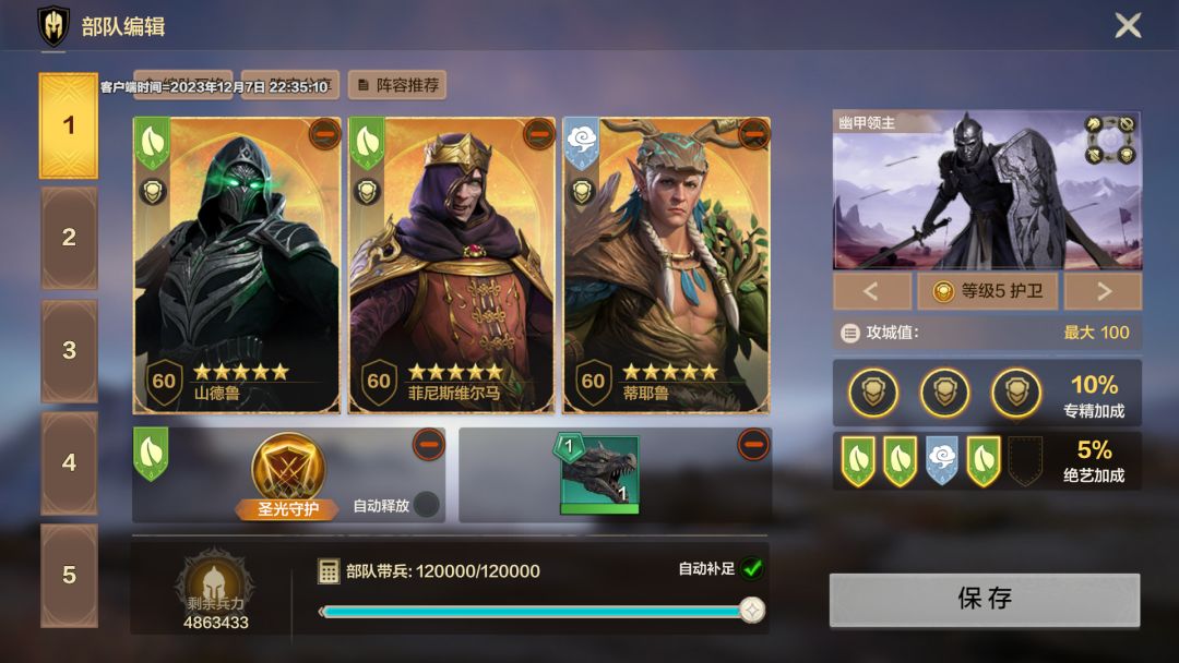 山德鲁队伍以技能伤害为主,因此圣堂剑士兵种特性强化普攻伤害对队伍提升有限,暮园幽甲兵提升闪避率和森林戍卫提升技能免伤,可以强化部队防御属性,完美契合山德鲁生存属性强的优点。