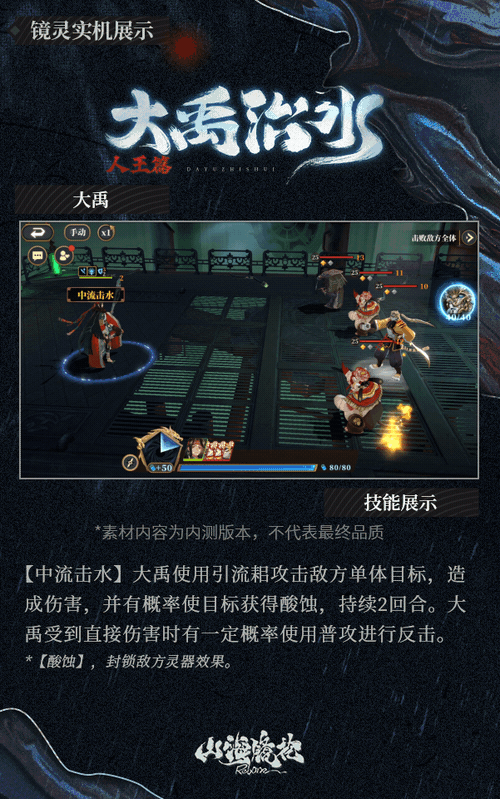 中流击水:大禹使用引流耜攻击敌方单体目标,造成伤害,并有概率使目标获得酸蚀,持续2回合。大禹受到直接伤害时有一定概率使用普攻进行反击。