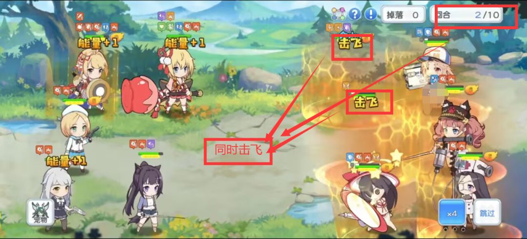 4、被击飞的目标落地的顺序,这个顺序跟目标站位先后和目标击飞前是否释放技能有关,不一定是站位靠前的先落地,但不管是谁被击飞,回来的顺序如何,肯定会损失一回合释放技能的时间。