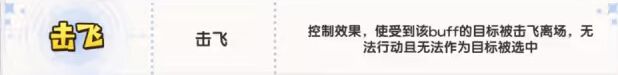 击飞:控制效果,使受到该buff的目标被击飞离场,无法行动且无法作为目标被选中。