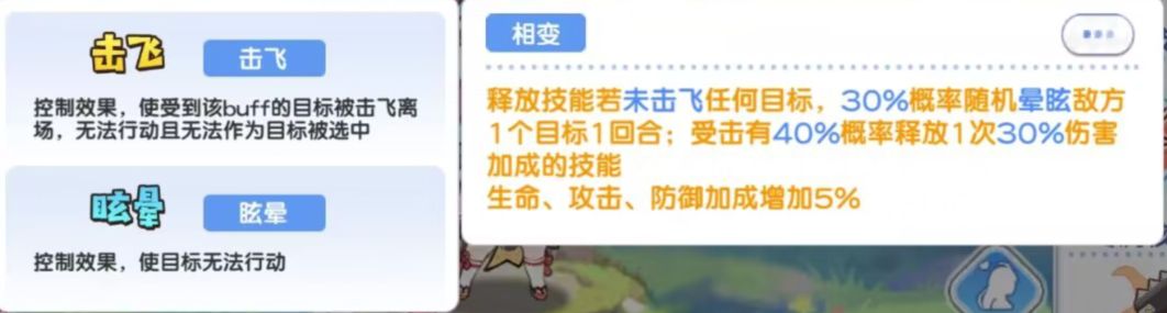 释放技能若未击飞任何目标,30%概率随机晕眩敌方1个目标1回合;受击有40%概率释放1次30%伤害加成的技能