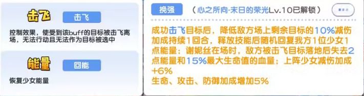 成功击飞目标后,降低敌方场上剩余目标的10%减伤加成持续1回合,释放技能后随机回我方1位少女1点能量;谢妮丝在场时,敌方被击飞目标落地后失去2点能量和15%最大生命值的血量;上阵少女减伤加成+6%