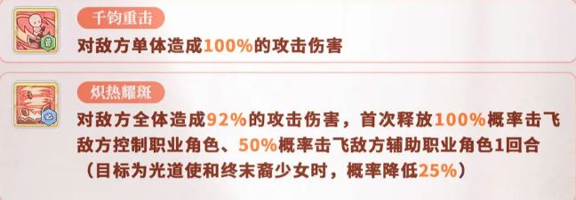 技 能——炽热耀斑:对敌方全体造成92%的攻击伤害,首次释放100%概率击飞敌方控制职业角色、50%概率击飞敌方辅助职业角色1回合(目标为光道使和终末裔少女时,概率降低25%)(击飞是烈阳谢妮丝的核心机制,但技能的击飞只能首次释放的时候触发,如果第一回合被控制或者各种原因导致没放技能,第二回合开技能也算首次释放,也可以触发击飞的。)