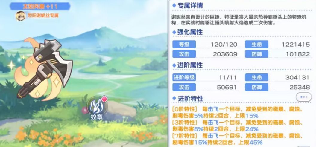 专属核心——太阳风暴:谢妮丝亲自设计的巨锤,特征是将大量余热导到锤头上的特殊机构,在实战时能够让锤头喷射火焰造成二次伤害。