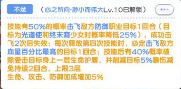 技能有25%/50%的概率击飞敌方防御职业目标1回合(目标为光道使和终末裔少女时概率降低25%),成功击飞1/2次后失效:每次释放第四次技能时,必定击飞敌方血量百分比最高的目标1回合:技能后有40%概率破除受击目标身,上一层生命护盾,并削减目标5%暴伤减免持续2回合,上限3层