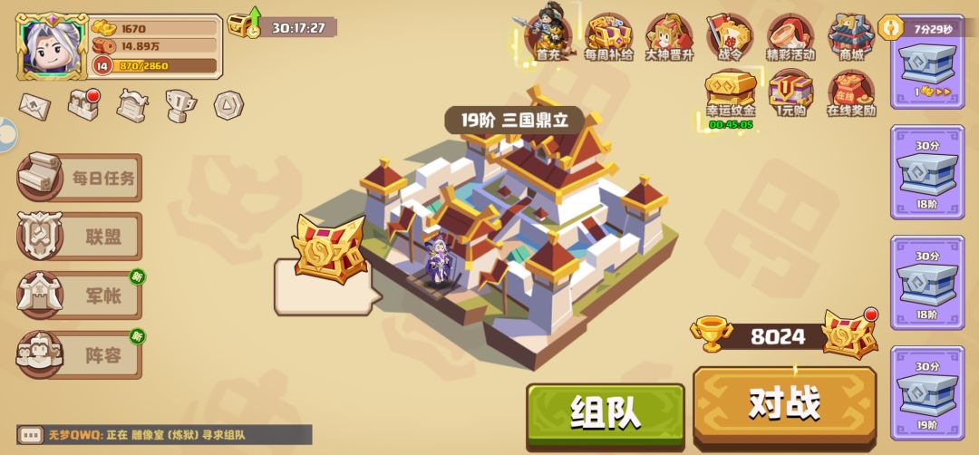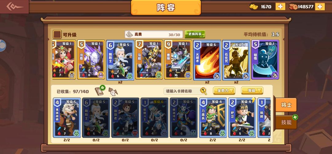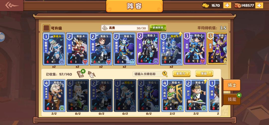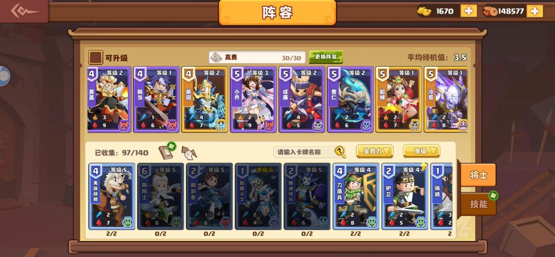 一,资源投入给强势卡。有很多高分段的卡不需要太高等级就能发挥很好的效果(比如蓝卡中的御剑者,阴阳师,这次的赛季卡骷髅斗士,紫卡里的韩当,孙韶,成廉等)因此自选卡牌前期尽量不要乱用,等到解锁强势卡再用。低分段上分还是比较简单的,可以用快攻卡组快速上分,在四五千杯后转型卡组。