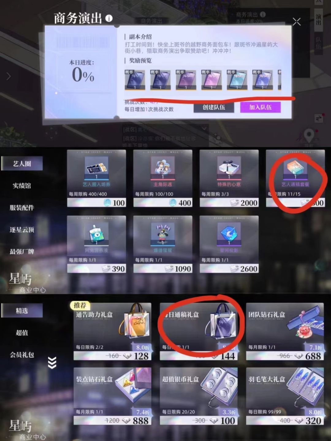 ②不买每日热卖(橙色超值福袋)和礼包精选(通告助力礼盒、每日通稿礼盒)这种能够获得顶流或者国民的通告,这种是必买的,不然你的人气是跟不上的
