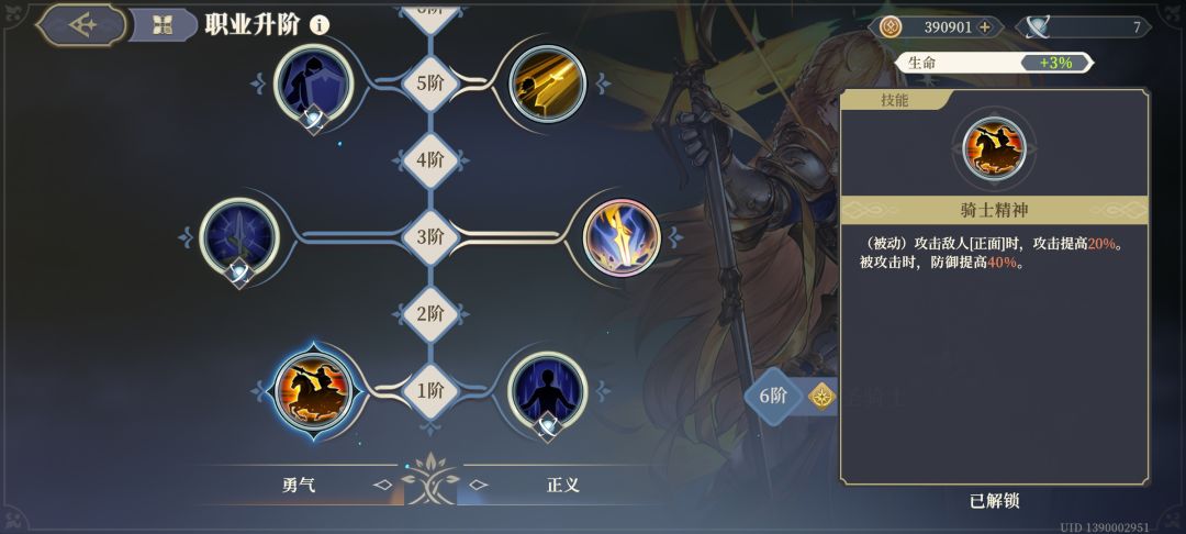 回击技能,在回合外受到攻击,在攻击范围内可以反击,造成普攻的70%伤害,增加输出的技能。左是正面防御,正面受到的伤害降低30%,这个骑士精神已经增加了些坦度,况且队伍里有麦莎当抗伤的角色,所以不推荐选择左。
