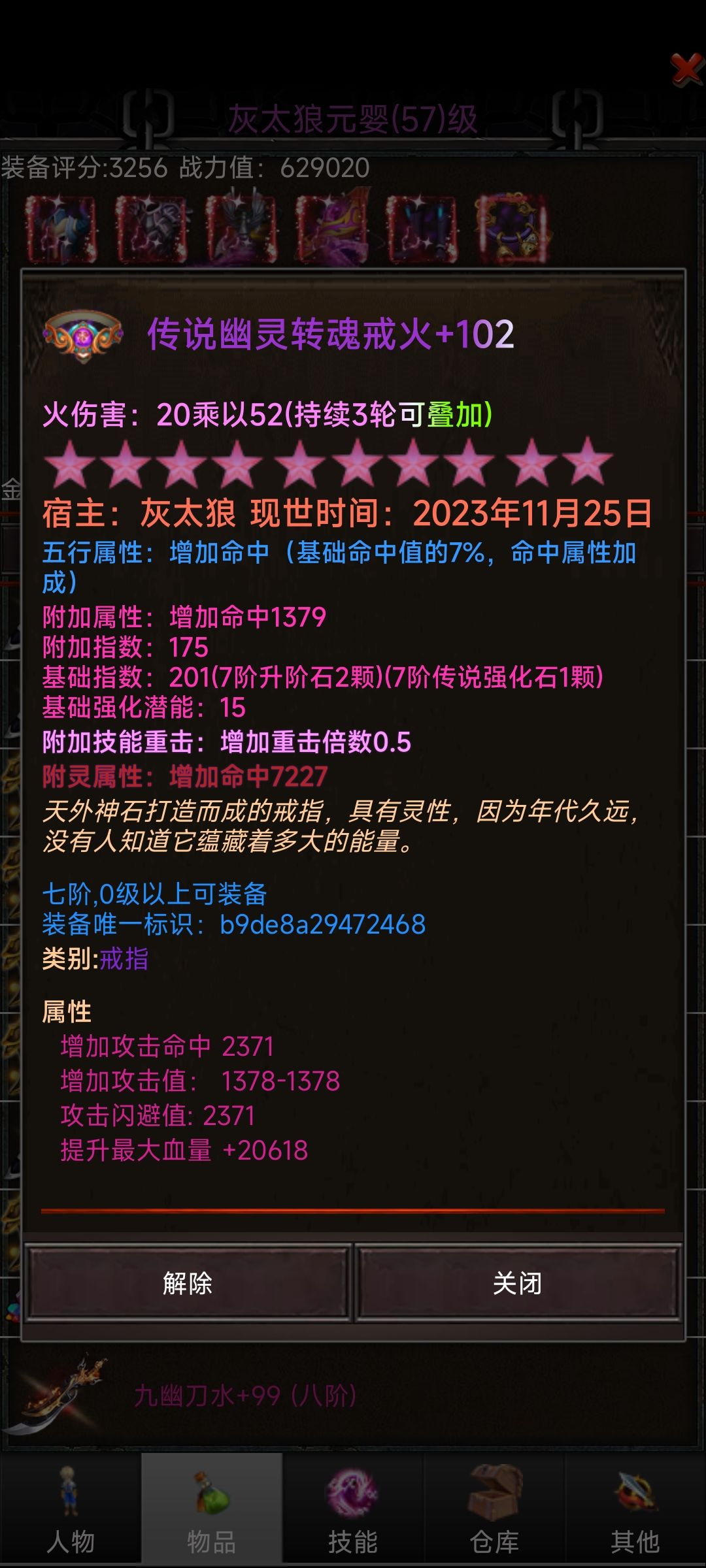4 关于装备 这里主要说十阶之前的装备,首先装备名后面的数值越高,装备附灵属性值范围越高,为什么说是范围,你们拿图6对比图7就知道了,103的比102的附灵还低几十命中,阶数越高可能范围波动越大。