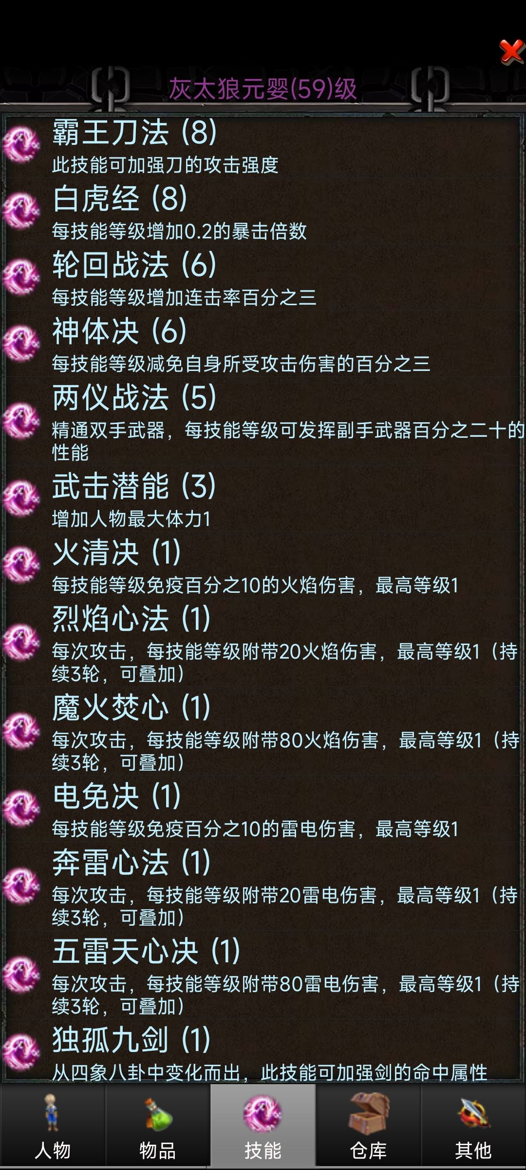 5 技能加点,两仪剑法满级,白虎经点满,霸王刀法点满,武击潜能3级,这套加点需要带减2体力项链,可以在卡39级刷三阶西门的时候效率最大化,如果想更快,建议带个暴击铃铛,就是有点费药