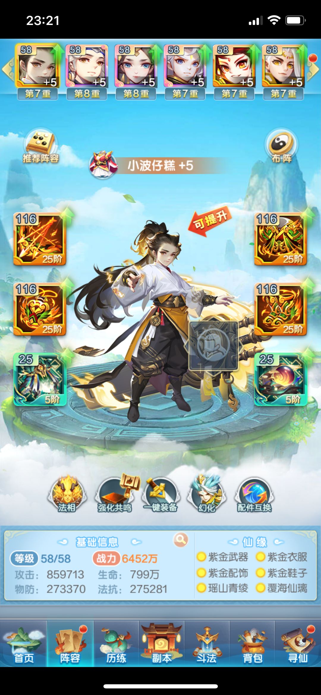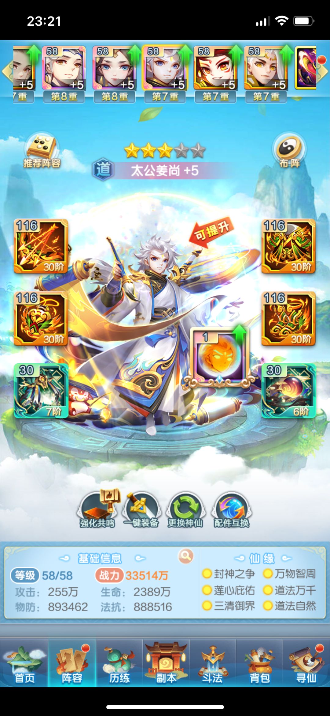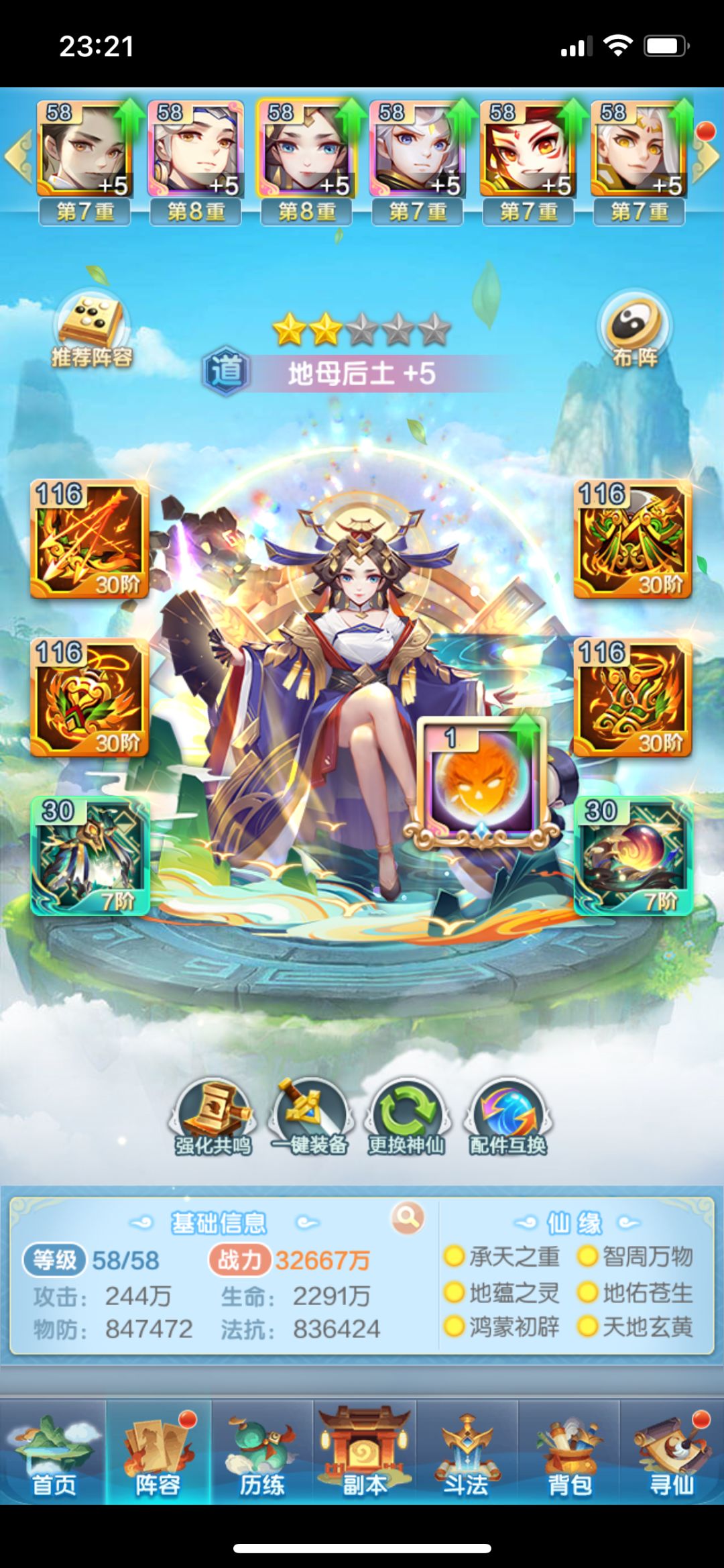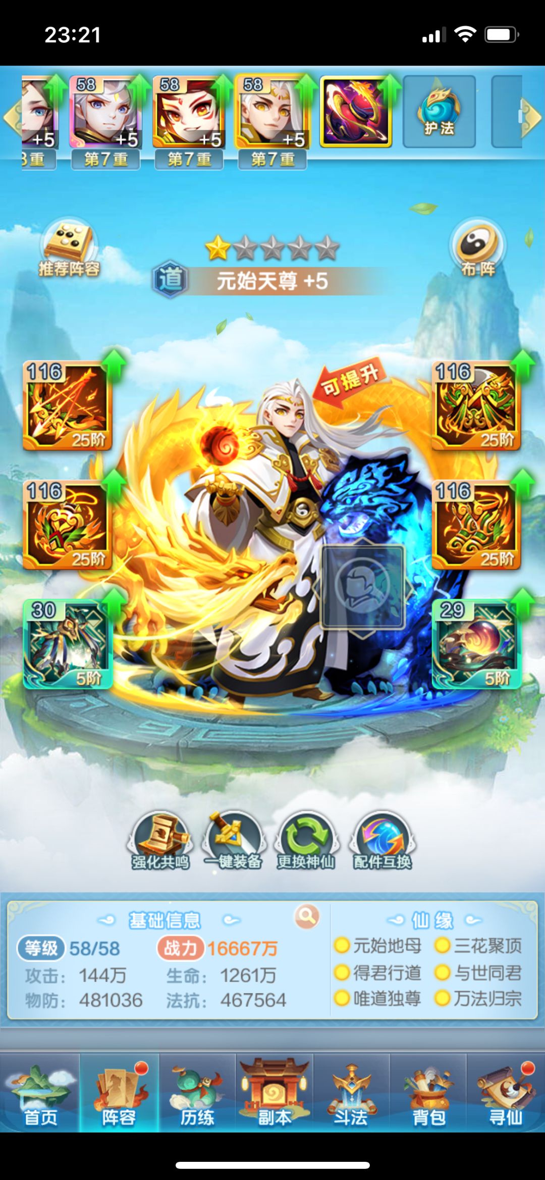 23:00上线先消红点,助威四中三运气不错,一健除魔/神游,给主核法宝幡升到一星、天命选攻击,青曜装备优先开给紫虚装备用来回响,竞技宝库换盘古斧+葫芦、战功宝库优先换金元神有多余的再换高级丹、仙盟宝库换金法宝&原胚&天机令玉、天机店铺每日必换2个金丹、元神店铺优先换青曜元神(成就里的不急着换),清空体法力,副本推到第31章、天宫142层,第六天结束,战力16亿、等级58级、元宝18万。