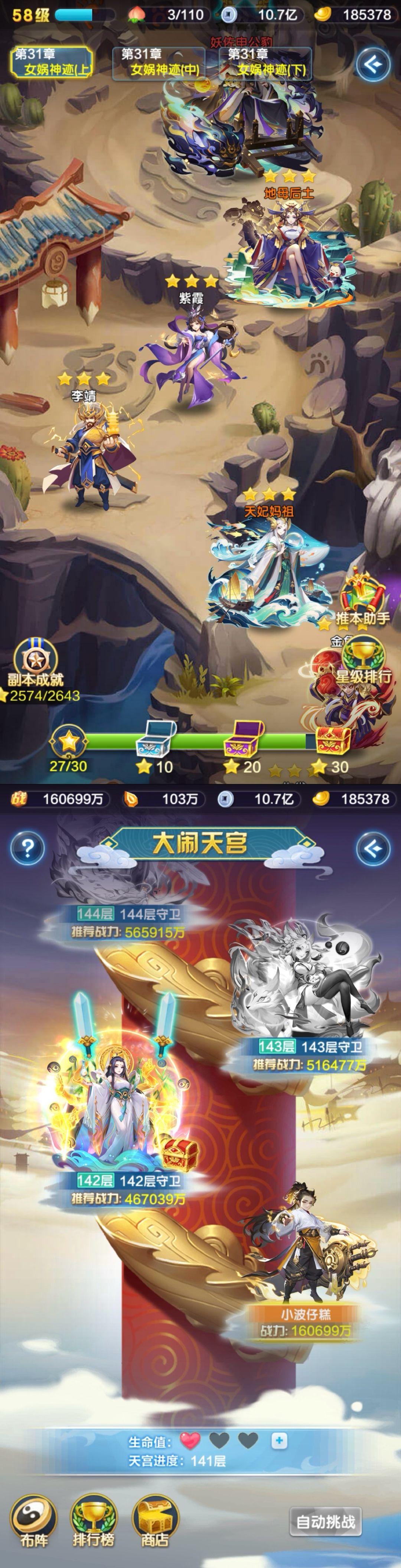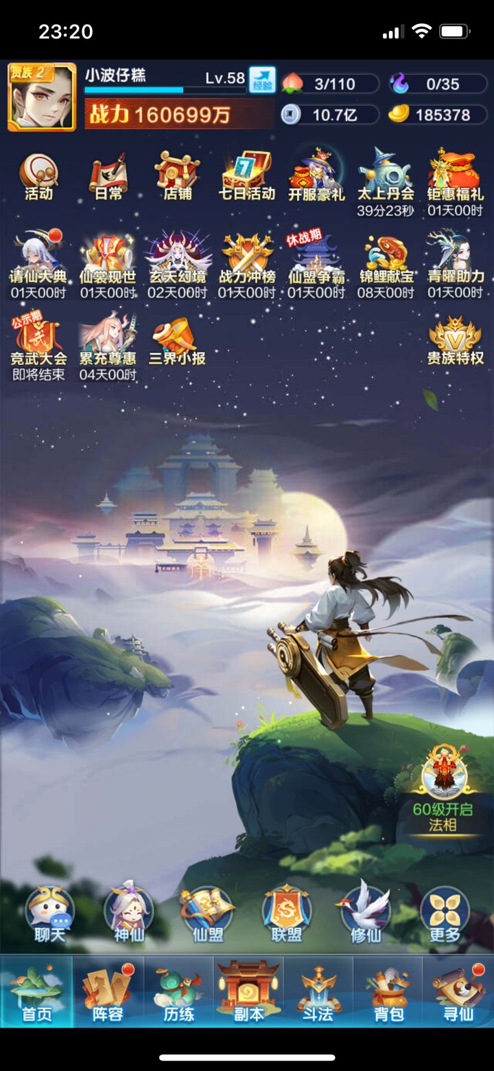 12:00上线先消红点,一健除魔/云游/神游/神仙店铺,清空体法力推图到第30章升到58级,升级一下神仙装备幻化,仙盟争霸优先打自己打得过的,竞武大会随便猜就好了基本全错的哈哈,大家晚上再确定助威会好一点,元宝来到18w。