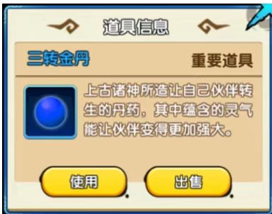 三转金丹,上古诸神所造让自己伙伴转生的丹药,其中蕴含的灵气能让伙伴变得更加强大。