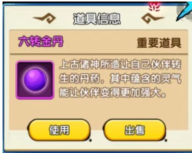 六转金丹,上古诸神所造让自己伙伴转生的丹药,其中蕴含的灵气能让伙伴变得更加强大。