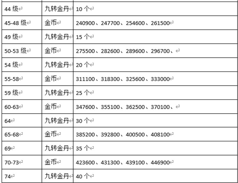 宠物44级升级时须要消耗10个九转金丹,为宠物提供大量战斗力。