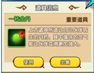 一转金丹,上古诸神所造让自己伙伴转生的丹药,其中蕴含的灵气能让伙伴变得更加强大。