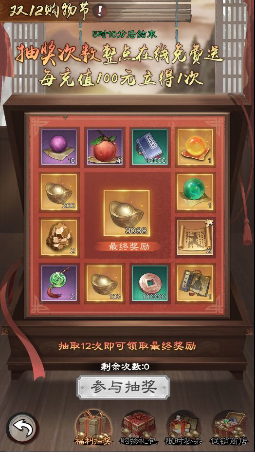 通过元宝和双12金券,抢购限量道具,红品功法、神兵利器……拼手速的时候来了!