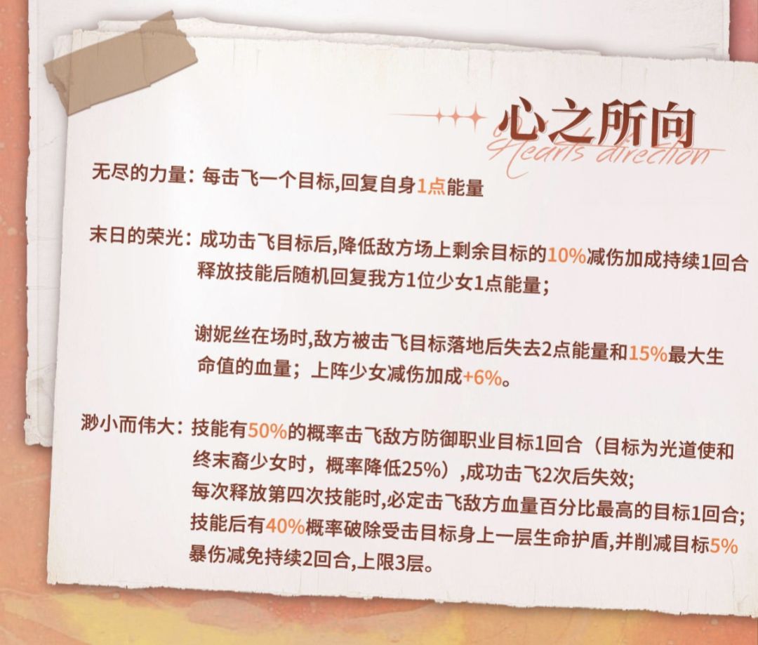 心二主要对被击飞目标更大力度的折磨,会对被击飞目标减能和其生命固定百分比伤害(虽然是在目标落地后才会给予这个惩罚,都差不多了啦~)间伤能力和强化增伤追击,赋予了谢妮丝在战场也有一定输出伤害,为人类追击收割垫下了基础。并永久增加己方少女6%伤害减免。