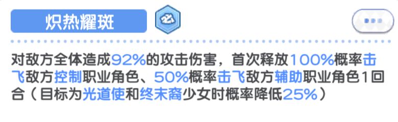 技能【炽热耀斑】:技能对敌方全体造成92%攻击伤害,首回合对敌方控制职业少女拥有100%的概率命中,谢妮丝在第一回合是必定击飞控制型少女,并且没有击飞目标上限。即对面如果有6名控制型少女,谢妮丝能在第一回合击飞对面6人。这里只是举例哦,没有人会傻乎乎的上6控制少女捏~所以50%概率击飞敌方辅助职业少女,在觉醒和提升心之所向后,会提升对防御少女的击飞概率和次数。才是谢妮丝最关键,最核心的技能。 为什么说是最关键核心的技能呢?由于谢妮丝没有对击飞职业的少女目标有明确指标数量,所以概率好,运气好的话可以在第一回合就能将敌人全部控制,辅助,防御少女都击飞。虽然对辅助的概率少了50%,但实测会高于50%,第一回合击飞所有控制和辅助的概率会很高。目前的队伍搭配采用最多的就是1治疗1防御2输出2辅助职业了。如果谢妮丝可以带走一半的敌人,对我们而言就有了很好的对局控制权。在PVP环境中这是很有利的哦~但正因为如此,或许是考虑会有“锤天帝”问世,所以在后续回合技能概率这一块,谢妮丝触发击飞频率就不是很稳定了。策划告诉谢妮丝可以让她有一次一展雄风的机会,确没有给她“太阳风暴”的使用说明书。
