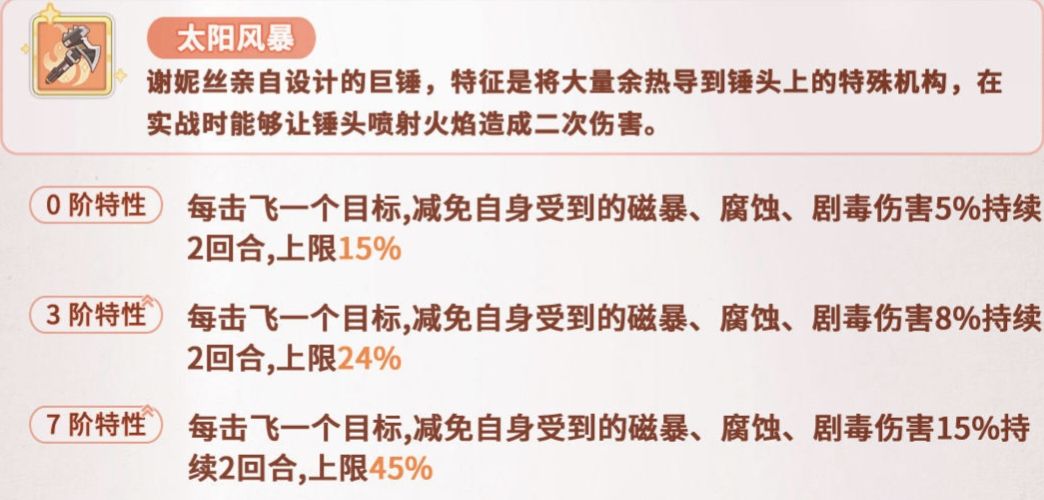 作为匠人,一把好用趁手的工具是必不可少的,烈阳的关键词也来源于大锤会喷火的设计(倒不如说烈焰更好)谢妮丝专属武器“太阳风暴”使其在击飞目标后,可以增加自身对毒异磁间伤的抵抗能力。被击飞目标越多,间伤减免就越高。但受各种环境因数限制,除在第一回合最容易叠加外,后续因为概率等问题很难吃满收益。