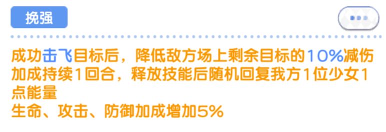 觉醒2谢妮丝成功击飞目标后,会降低场上剩余敌方少女10%的减伤,也就是附加易伤效果啦,减少对面10%的减伤,换一种说法对我方少女增伤10%持续一回合。然后回复我方随机少女1点能量