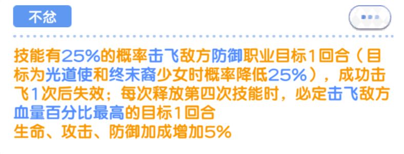 觉醒4谢妮丝此时对敌方防御少女也能击飞啦,每释放第4次技能必定击飞敌方在场少女血量百分比最高的目标。前者能概率击飞防御少女,但概率很低,只有25%,而光暗少女自带25%的抗击飞概率,所以觉醒4无法击飞光暗防御。并且击飞防御少女数量是有次数限制的,四星只能击飞一次,在击飞后不会再击飞防御少女。但这里有一个例外,就是后者的在场百分百血量最高的目标,如果此时防御少女血量最高,该情况是可以生效的。如果多个少女均为满血状态会随机击飞。觉醒5的技能追击也算释放的技能次数。