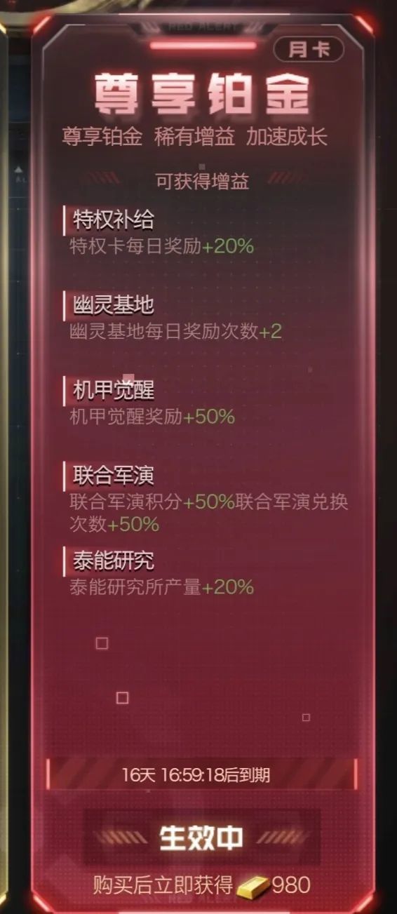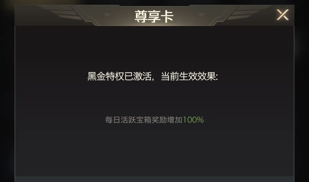 提醒大家注意的是:黑金特权和铂金特权在购买前如果已领取了含有增益加持的功能或活动奖励后,再购买后不会进行额外的加成奖励,所以大家如果尊享卡到期,一定记得先开卡尊享卡后再去领取特权卡奖励!