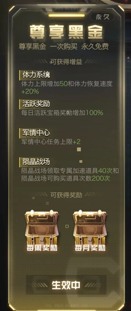 黑金特权中会激活四个增益效果加持: