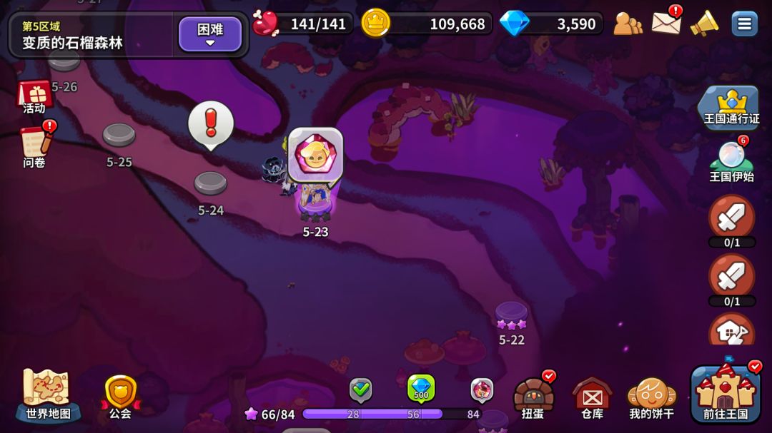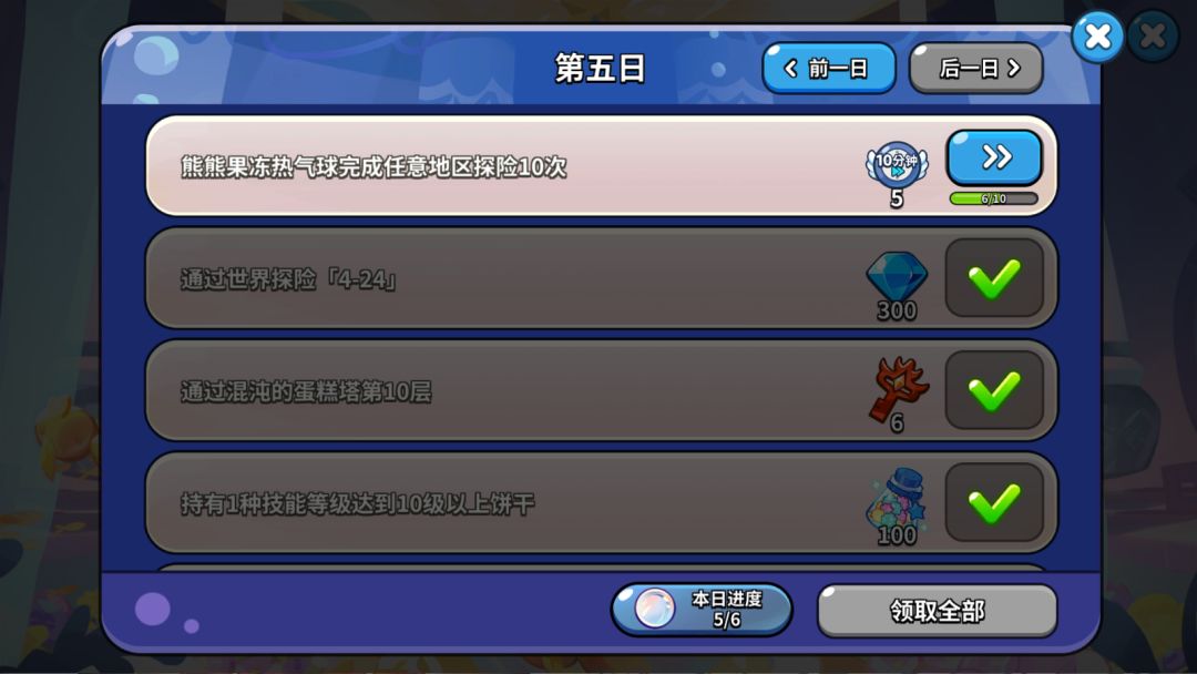 饼干人游戏第五日,这一天暂时不会有额外的项目解锁,核心游戏内容就是在完成熊熊果冻热气球的探索,刷困难副本,挑战混沌的蛋糕塔等等。