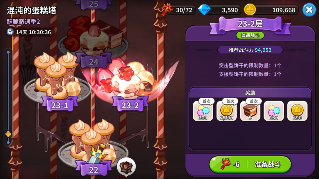 混沌的蛋糕塔一定要打!挑战蛋糕塔所消耗的钥匙会随着时间的推移恢复且有上限,能挑战的就往上推,不要浪费材料。第五天的战力至少能推23层,推到25层是玉露芥子莲第七天的任务需求。
