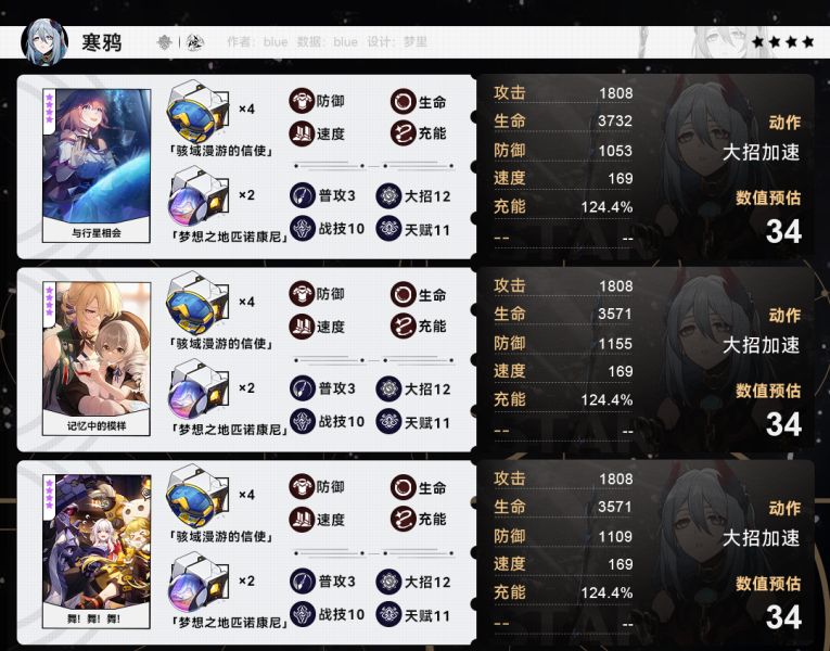 寒鸦的辅助能力只与自身速度和行迹等级挂钩,那么就可以有两个主词条带生存词条,选择一生命一防御。速度鞋充能绳应该没什么疑问。