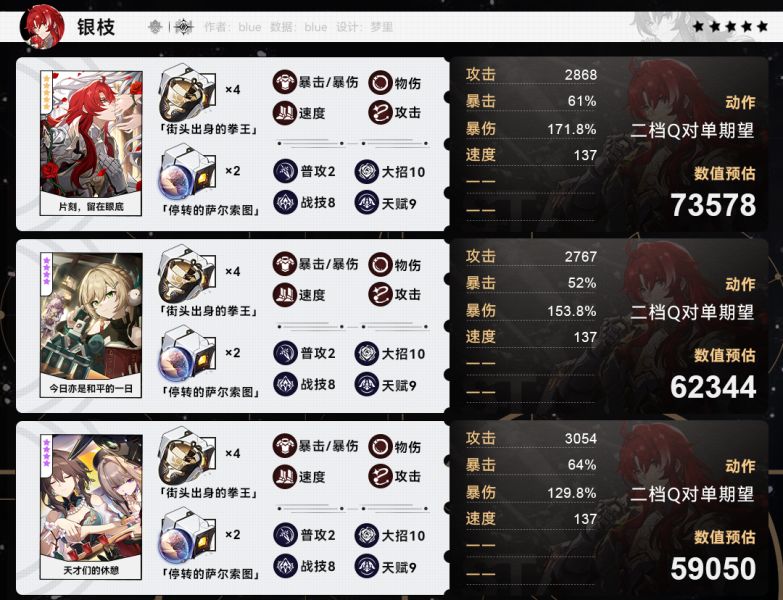 银枝也是周期性爆发角色,输出周期直接与速度挂钩,鞋子直接锁定速度。也有特殊情况,例如带二命鸭,或者高速停藿充低速银枝两动一大的玩法。