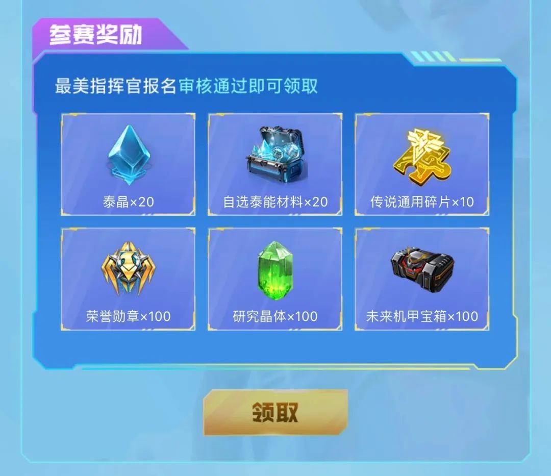 成功报名并入选后(3个工作日内审核),100%获得道具大礼包奖励,礼包包含:【泰晶】、【自选泰能材料】、【传说通用碎片】等6款道具!