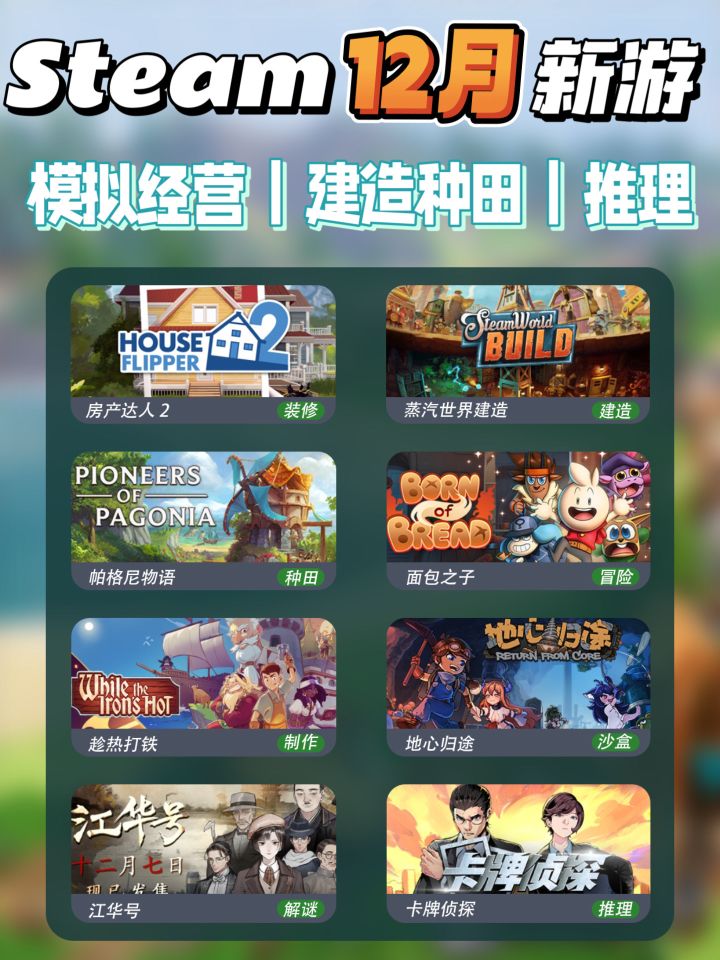 十二月Steam新游合集来啦,这个月没啥大作但是有超多建造和模拟经营题材的游戏,喜欢这类型的姐妹不要错过啦!