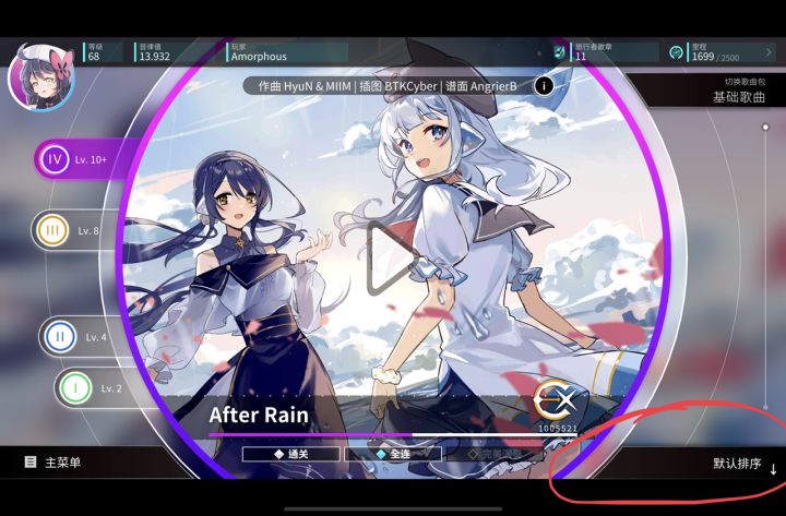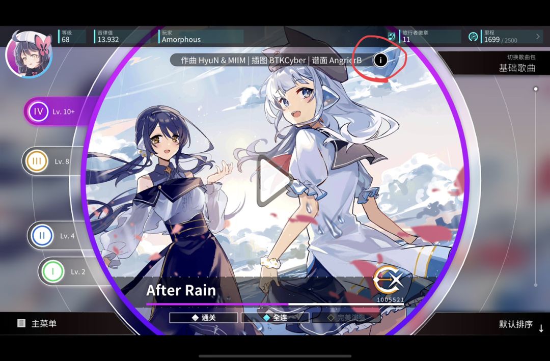 点击曲绘上方的i 小按钮可以查看完整曲绘,画师,曲师和谱师,还可以查看曲目来源