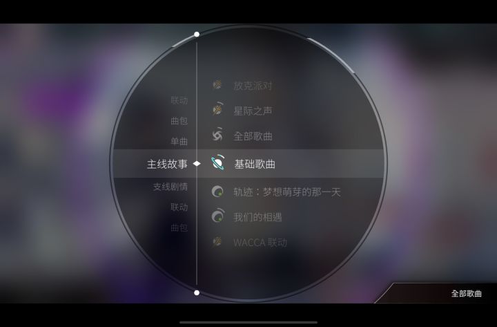 点击右下角按钮可以进入当前曲包曲目列表,上下滑动可查看