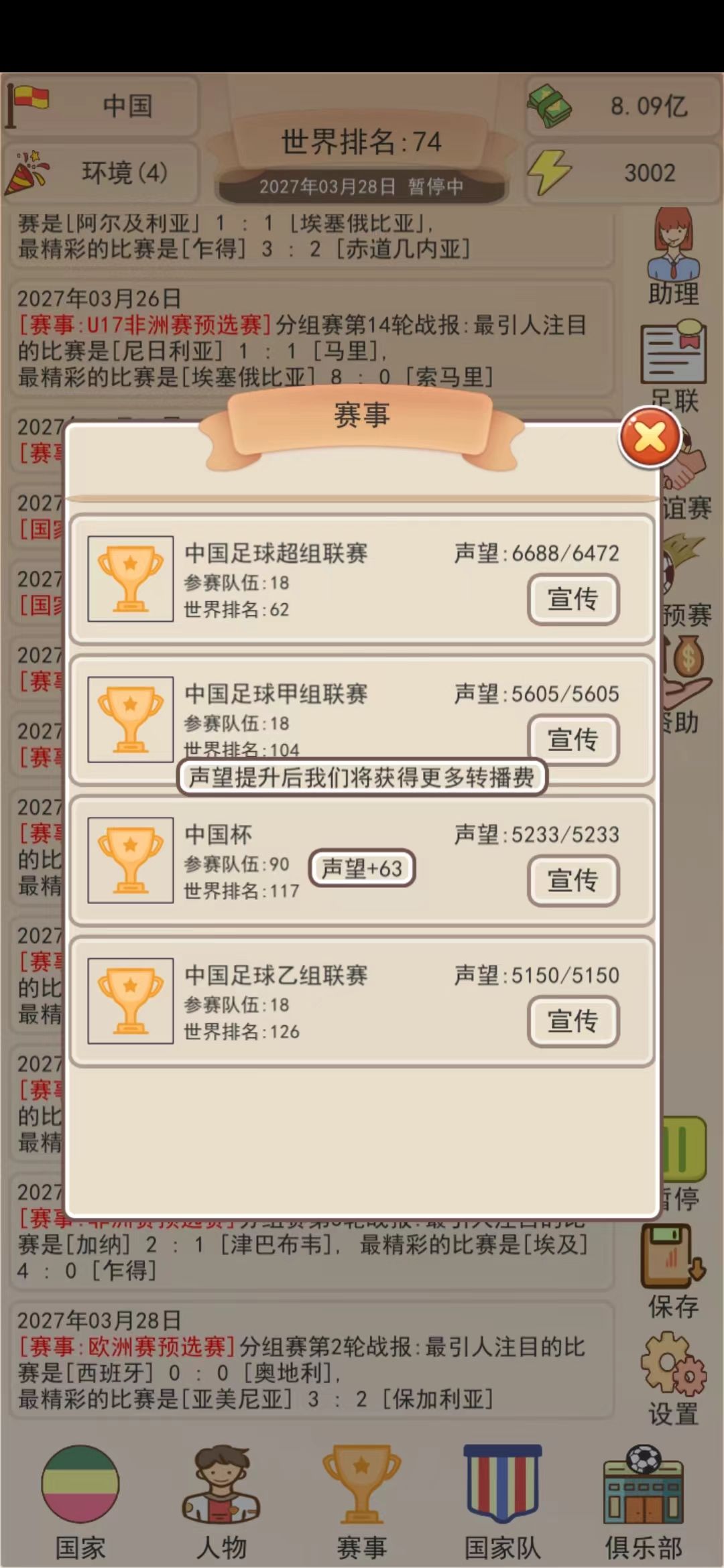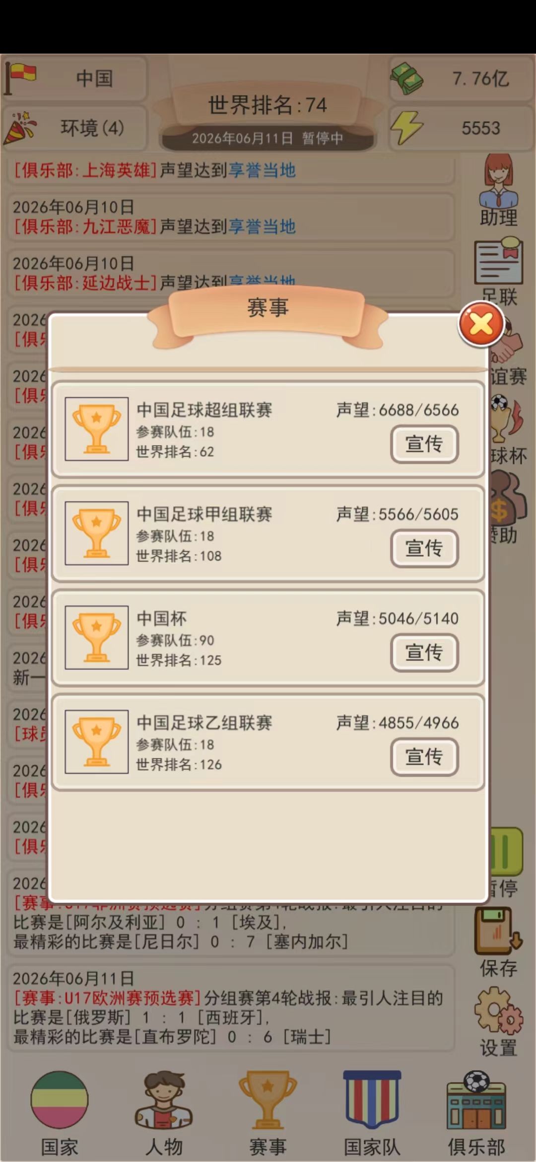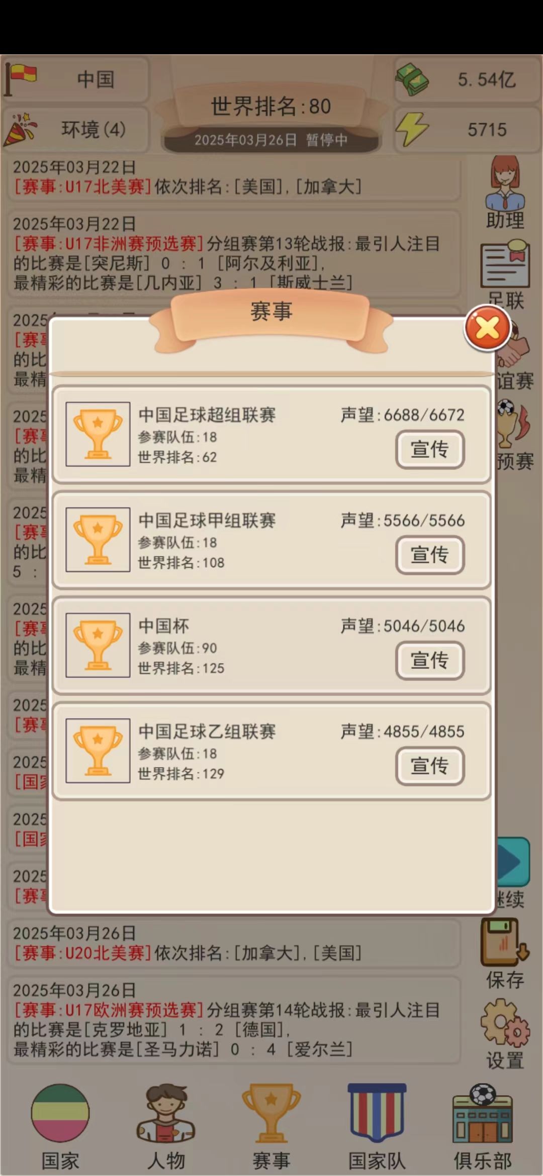 关于“全拿走才是最速发展,你自己试试就知道了。俱乐部一点都不重要。国家队参加世界比赛的结果只看球员能力。把分成全部给足协,不管俱乐部,前30年国内四项赛事声望也是正增长。而30年球员能力已经能点到90了。点到87就已经大概率世界杯冠军了。前二十年是正增长,然后放缓倒退。但这无所谓,四十年后球员能力100我直接建新俱乐部,俱乐部初始能就是50,而且是会员制会自动发展,直接淘汰旧俱乐部就行了。赞助式倒退到50以下本来就是目的,我希望他能力越低越好,这样就能被踢出联赛了。这就是新旧迭代阵痛期。”观点,我亲自实践了一番结果如图