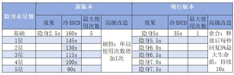 道具改动:新版本中对于隐身衣的底层机制有所改动,可以说重做也不为过,具体改动如下。