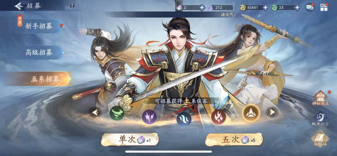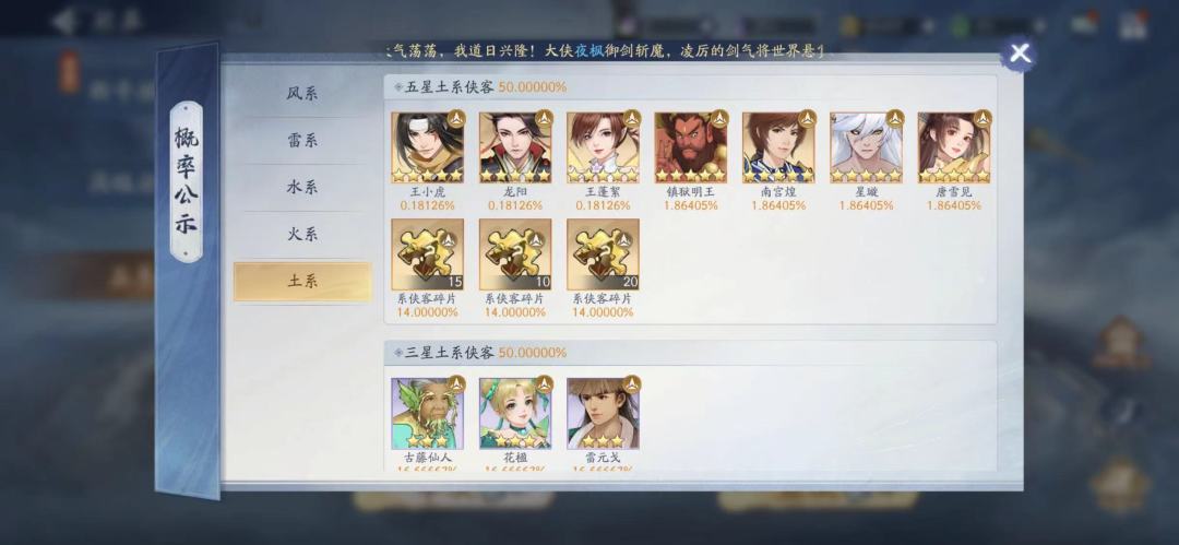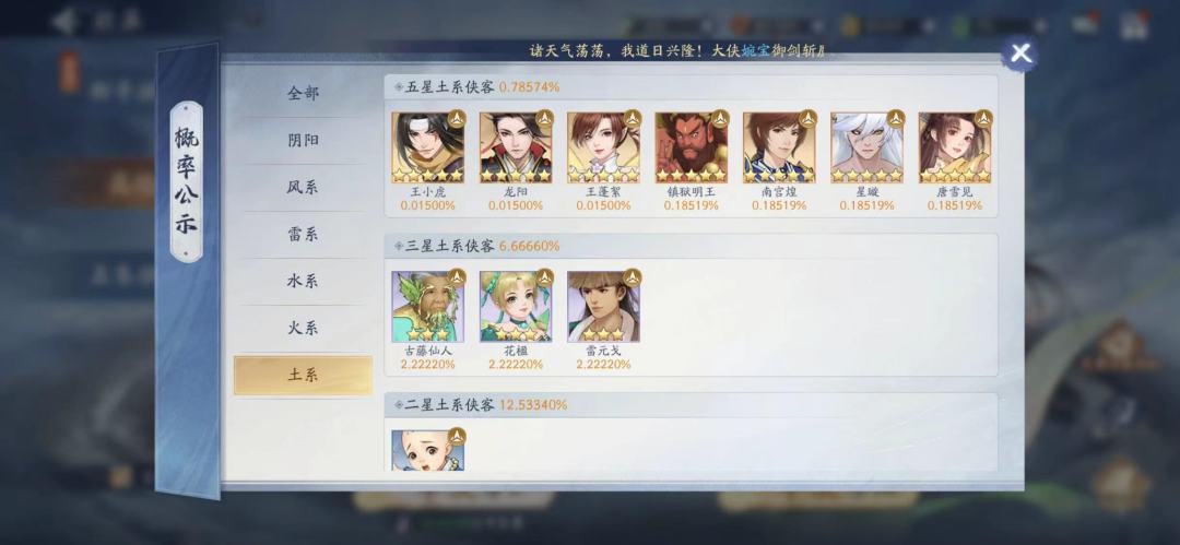 1. 土南宫的获取渠道:高级招募概率获取,100个五系石头兑换,5星普通侠客箱子,比武大会,寻仙路兑换,普通侠客碎片合成,五系石头(土系)招募。整体获取途径以高级招募概率获取即可,成型的土南宫是15星,也就是需要获得16个本体。