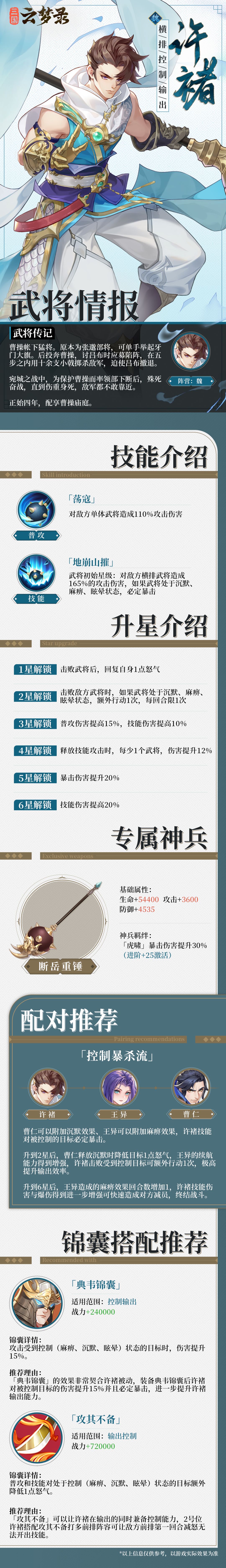 小将军好!《三国云梦录》与大家见面啦~想必各位小将军对诸多武将感到好奇。小乔今天为大家带来了许褚的武将情报!请小将军查收哦~
