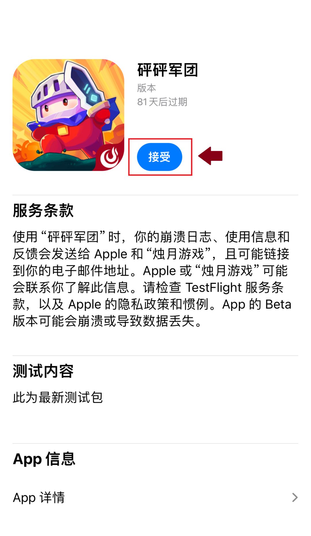 3.安装游戏客户端:正式开测后,前往【测试页面】(砰砰军团的TapTap主页),点击【前往体验】将跳转测试链接(如跳转不成功,可尝试使用iOS默认浏览器Safari打开)。选择【接受】后,即可开始安装。