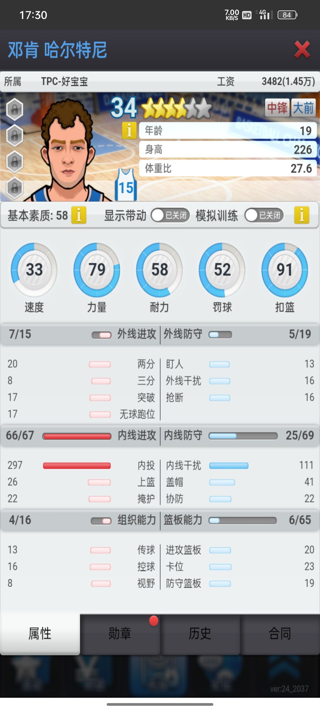 这个球员是小号在五联没有训练员练的,当外线第一核心还是差了点,当二当家还是可以的。