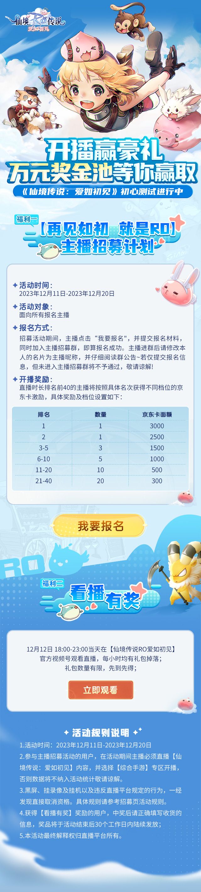双12晚18:00起,我们邀请到小宇热游、我浮夸真的要强、芜湖神、赵迪克、牛会长5位大神主播在微信视频号同步开启直播,前往《仙境传说:爱如初见》官方直播间观看,每15分钟连续5小时奖励掉落不停。