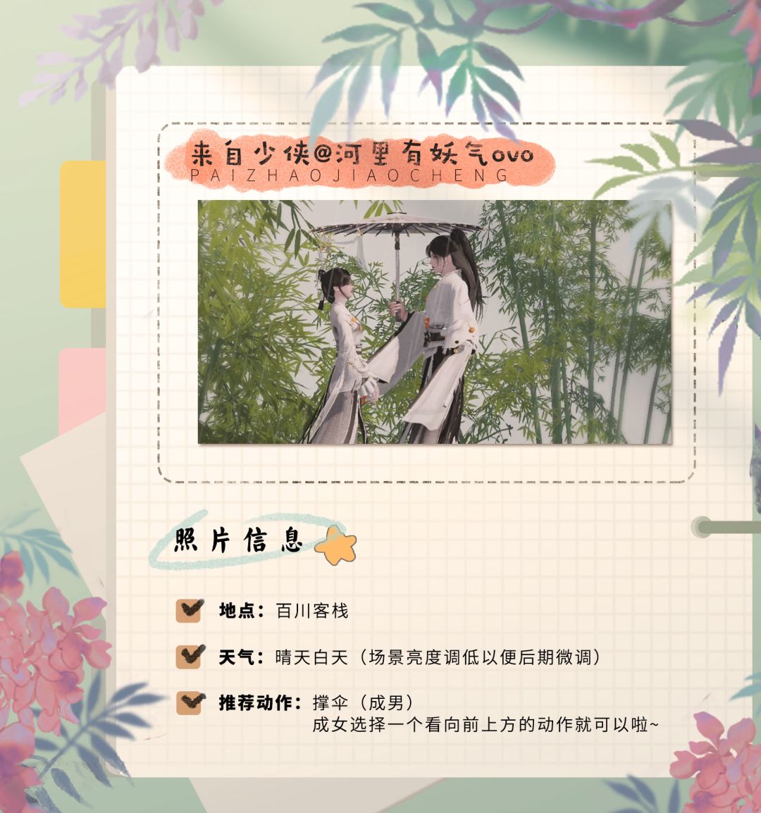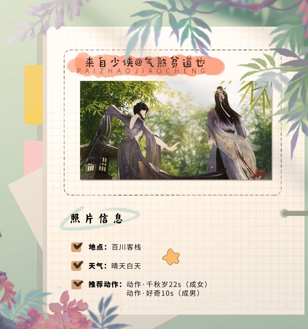 “一个动作卡一天,一错白忙一整天”曾是无数少侠拍照时不能承受之痛。为了给少侠们更便捷舒适的体验,全新【相机同步动作】功能现已上线。仅需【打开相机→可见内容→动作同步】,每一个少侠们都能轻松展现最有魅力的自己,定点你最爱的、最美丽的那一瞬!甭管是群像合影,还是双人合照,都加倍出片!我李小四还从众多拍照圣手中找到了或悠闲、或逗趣、或酷飒的拍照摄影攻略,现将武林不传之秘特别放送,少侠们快来轻松get新技能吧!
