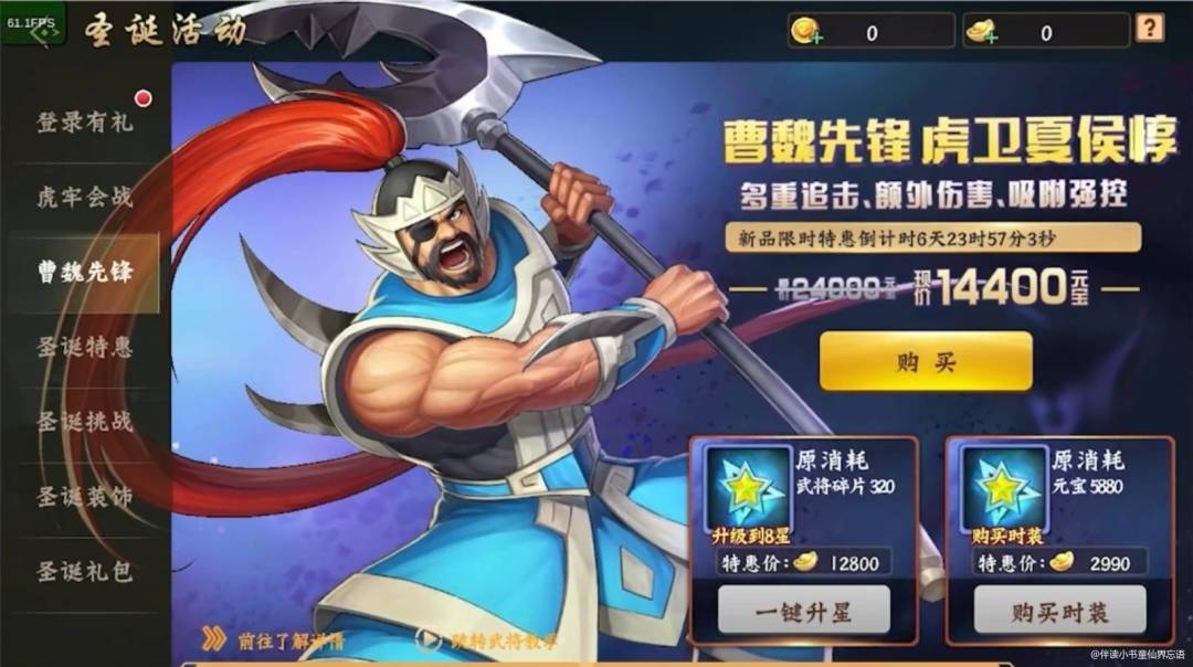 随着策划老陆的《双旦活动爆料》来看,虎卫夏侯惇+虎牢会战+圣诞树装饰活动将在圣诞节期间如期而至!副本武将稀缺,就看虎卫夏侯惇能否武能配位了!
