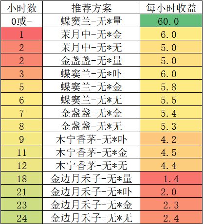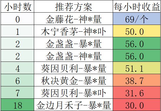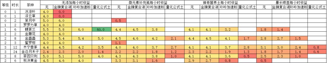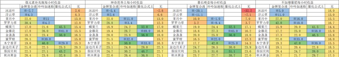 每小时收益总表(带※蓝底数据为可即成作物,单位为橡子/个)